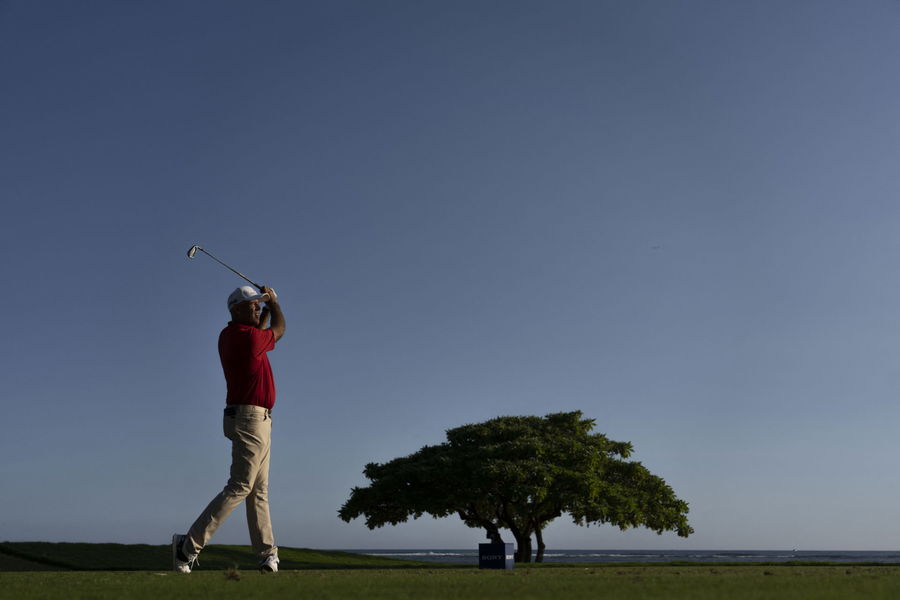 January 15, 2022; Honolulu, Hawaii, USA; Stewart Cink hits his tee shot on the 17th hole during the third round of the Sony Open in Hawaii golf tournament at Waialae Country Club. Mandatory Credit: Kyle Terada-USA TODAY Sports