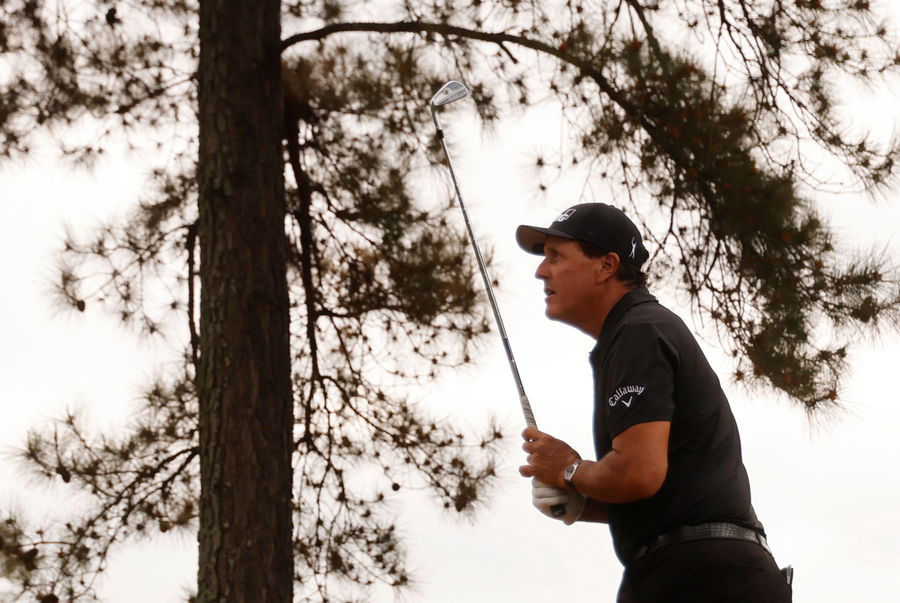 Golf – The Masters – Augusta National Golf Club – Augusta, Georgia, U.S. – April 9, 2021 Phil Mickelson of the U.S. hits his approach to the 1st hole during the second round REUTERS/Jonathan Ernst