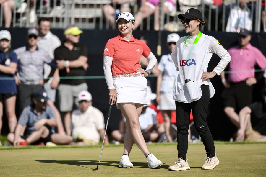 Jun 1, 2024; Lancaster, Pennsylvania, USA; Hinako Shibuno (JPN) on the 18th green during the third round of the U.S. Women’s Open golf tournament. Mandatory Credit: John Jones-USA TODAY Sports