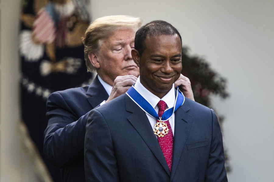 WASHINGTON, DC – MAY 6 : President Donald J. Trump presents the Presidential Medal of Freedom to Eldrick Tiger Woods in the Rose Garden at the White House on Monday, May 06, 2019 in Washington, DC. (Photo by Jabin Botsford/The Washington Post via Getty Images)