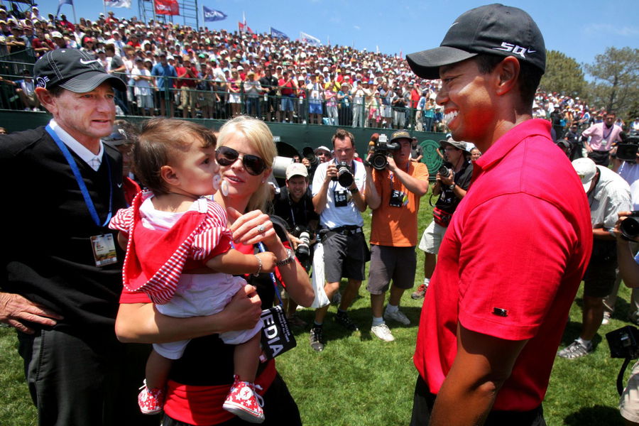 UNITED STATES – JUNE 16: Golfer Tiger Woods, right, greets his wife Elin, center, and their daughter Sam, foreground, as his coach Hank Haney looks on after Tiger won the 108th U.S. Open at Torrey Pines Golf Course in La Jolla, California, U.S., on Monday, June 16, 2008. Woods outdueled Rocco Mediate on the first sudden-death hole to win the U.S. Open after the two were tied at the end of an 18-hole playoff. (Photo by Sandy Huffaker/Bloomberg via Getty Images)