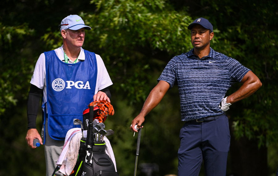 May 19, 2022; Tulsa, OK, USA; Tiger Woods and his caddie look on from the 17th tee during the first round of the PGA Championship golf tournament at Southern Hills Country Club. Mandatory Credit: Orlando Ramirez-USA TODAY Sports