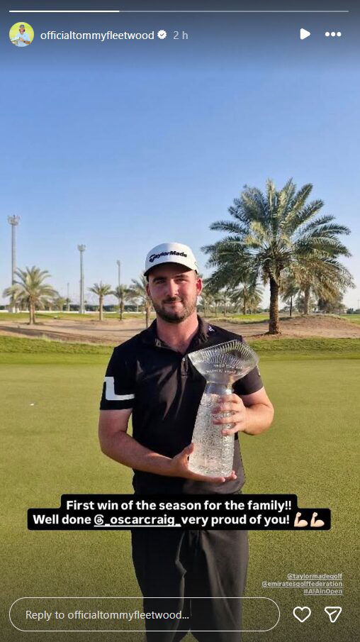 Fleetwood shared a story on Instagram with a picture of his stepson holding the AI Ain Men’s Open title. The caption read, “First win of the season for the family!! Well done @_oscarcraigh_ very proud of you!💪🏻💪🏻”