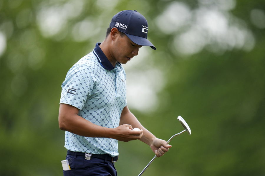May 20, 2023; Rochester, New York, USA; Justin Suh reacts after making a putt on the ninth green during the third round of the PGA Championship golf tournament at Oak Hill Country Club. Mandatory Credit: Aaron Doster-USA TODAY Sports