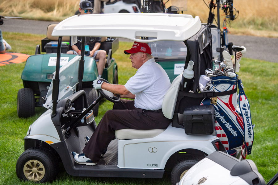 Jul 28, 2022; Bedminster, NJ, USA; Former President of the United States Donald Trump hops aboard a golf cart after hitting a tee shot on hole 1 during the Liv Invitational Pro-Am at Trump National Golf Club Bedminster. Mandatory Credit: John Jones-USA TODAY Sports