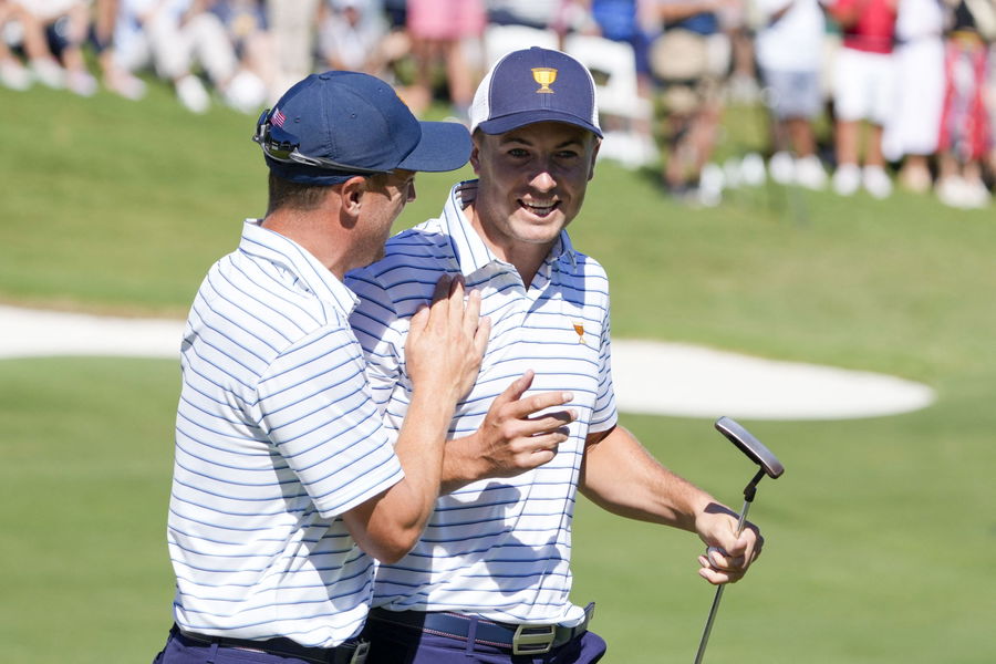 Sep 23, 2022; Charlotte, North Carolina, USA; Team USA golfer Jordan Spieth (right) and golfer Justin Thomas (left) celebrate on the 12th green during the four-ball match play of the Presidents Cup golf tournament at Quail Hollow Club. Mandatory Credit: Jim Dedmon-USA TODAY Sports