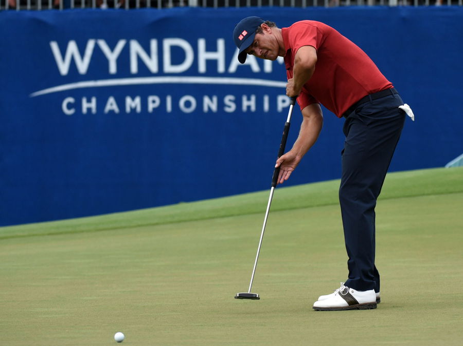 Aug 15, 2021; Greensboro, North Carolina, USA; Adam Scott putts on the ninth hole during the final round of the Wyndham Championship golf tournament. Mandatory Credit: Rob Kinnan-USA TODAY Sports