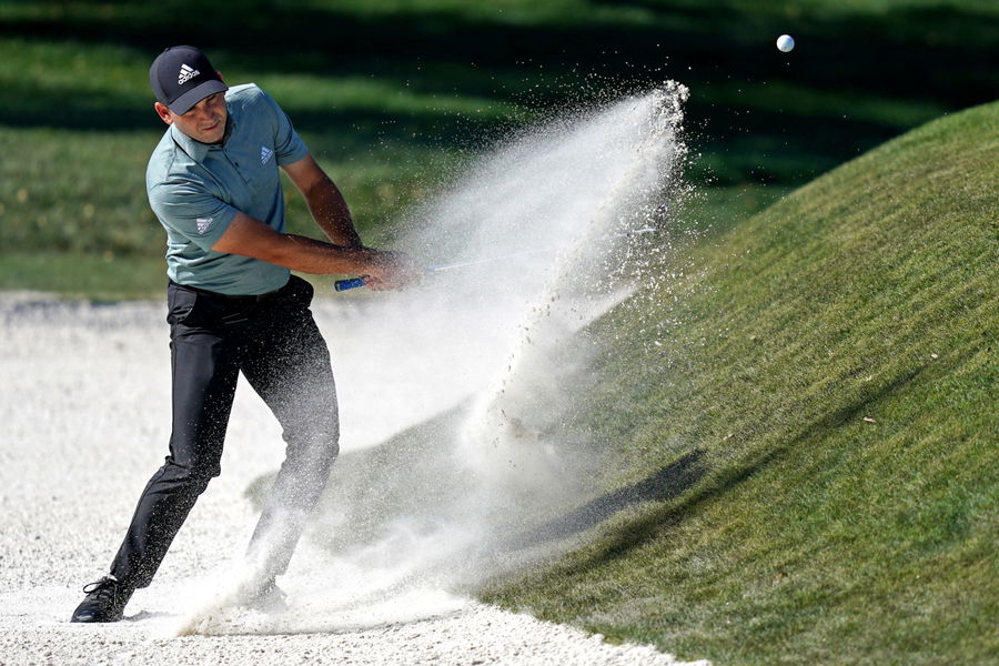 Mar 12, 2021; Ponte Vedra Beach, Florida, USA; Sergio Garcia plays a shot from a bunker on the ninth hole during the second round of The Players Championship golf tournament at TPC Sawgrass – Stadium Course. Mandatory Credit: Jasen Vinlove-USA TODAY Sports