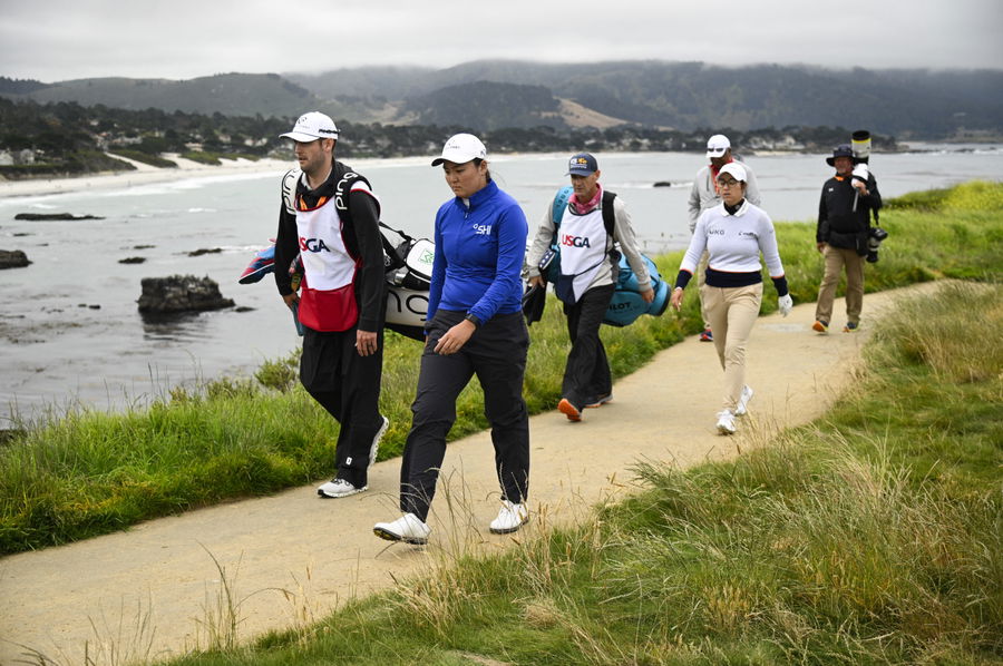 Jul 7, 2023; Pebble Beach, California, USA; Allisen Corpuz walks to the green followed by Marina Alex on the eighth hole during the second round of the U.S. Women’s Open golf tournament at Pebble Beach Golf Links. Mandatory Credit: Kelvin Kuo-USA TODAY Sports