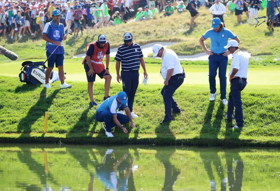 Golf – The 2023 Ryder Cup – Marco Simone Golf & Country Club, Rome, Italy – September 29, 2023 Team Europe’s Rory McIlroy and Tommy Fleetwood look at their ball near the water on the 16th hole as Team USA’s Xander Schauffele watches during the Foursomes REUTERS/Phil Noble
