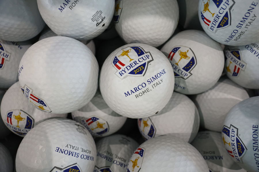 Golf – The 2023 Ryder Cup – Marco Simone Golf & Country Club, Rome, Italy – September 26, 2023 2023 Ryder Cup branded golf ball are pictured ahead of the event REUTERS/Carl Recine