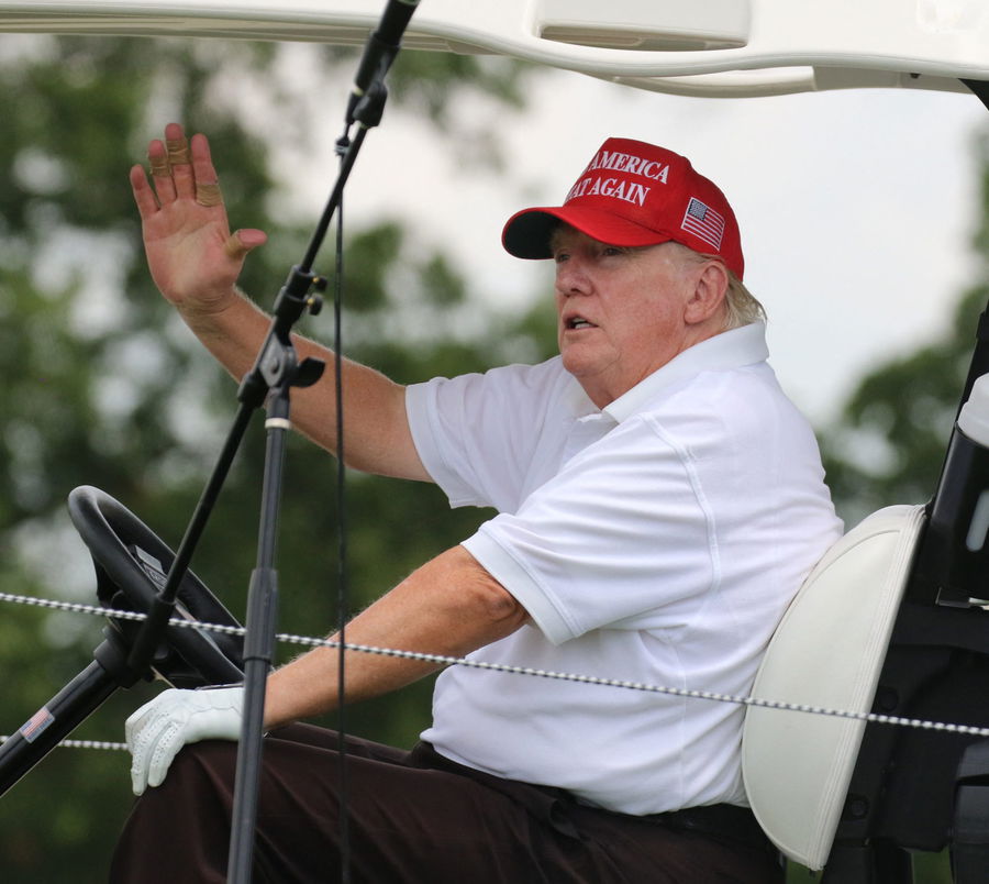 July 28, 2022; Bedminster, NJ, USA; Donald Trump during the Pro Am. The LIV Pro Am Tournament featured the former President of the United States, Donald Trump and his son Eric playing with with Dustin Johnson and Bryson DeChambeau at Trump National in Bedminster, NJ on July 28, 2022.Mandatory Credit: Chris Pedota-USA TODAY NETWORK