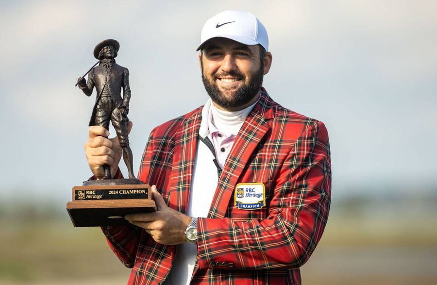 April 22, 2024: Scottie Scheffler presents his newly won Sir William Innes trophy after a rain delay pushed the final round of the RBC Heritage Presented by Boeing at Harbour Town Golf Links to Monday, April 22, 2024, in Sea Pines on Hilton Head Island. – ZUMAm67_ 0448082566st Copyright: xEstonxParkerxIiix