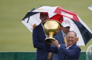 U.S. team captain Jay Haas holds up the Presidents Cup during the closing ceremony of the 2015 Presidents Cup golf tournament at the Jack Nicklaus Golf Club in Incheon, South Korea, October 10, 2015. REUTERS/Kim Hong-Ji