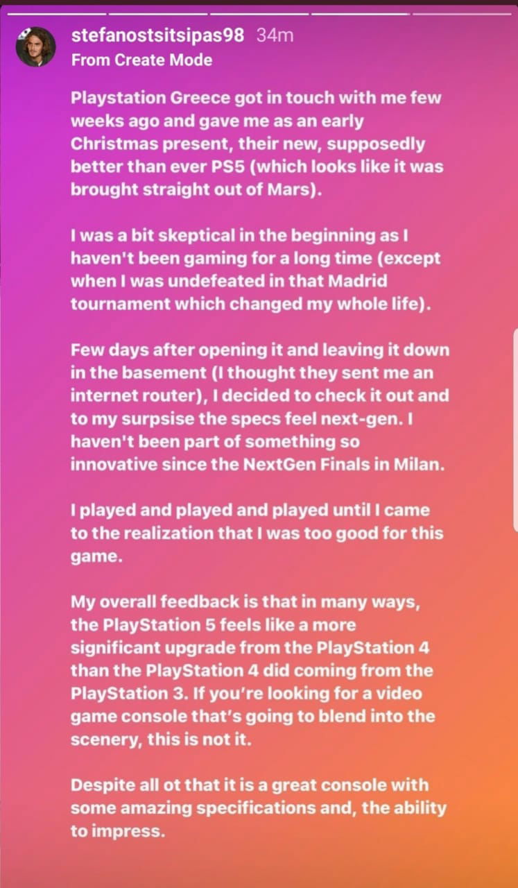 Tsitsipas wrote, “PlayStation Greece got in touch with me few weeks ago and gave me as an early Christmas present, their new, supposedly better than ever PS5 (which looks like it was brought straight out of Mars).”