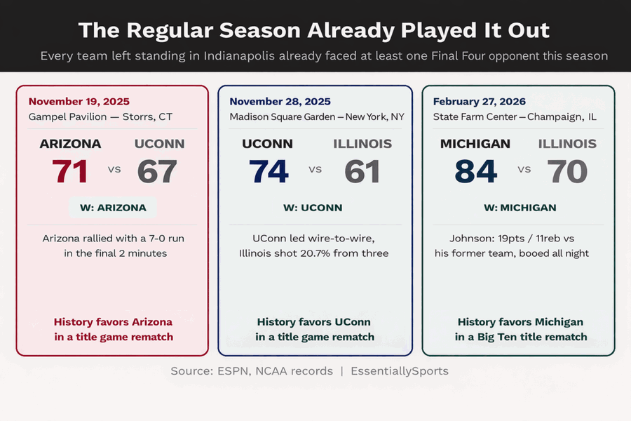 It’s happened three times in the modern era where a March Madness Finals featured two schools who squared off earlier in the campaign.
