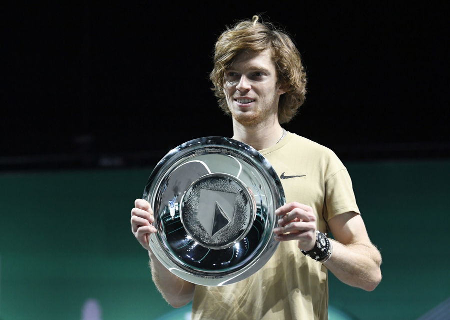 Andrey Rublev celebrates with a trophy after winning the Rotterdam Open. REUTERS/Piroschka Van De Wouw
