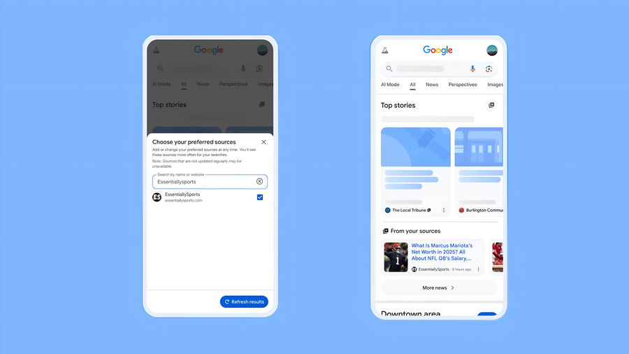 Google now gives you the power to decide which publishers show up first in your search results. The new Preferred Sources feature means you can tell Google to prioritize EssentiallySports whenever you search for the latest updates on your favorite teams, athletes, or events. Instead of leaving it up to the algorithm, you’ll see more of our breaking news, analysis, and exclusive stories in Top Stories and in the new “From your sources” box.