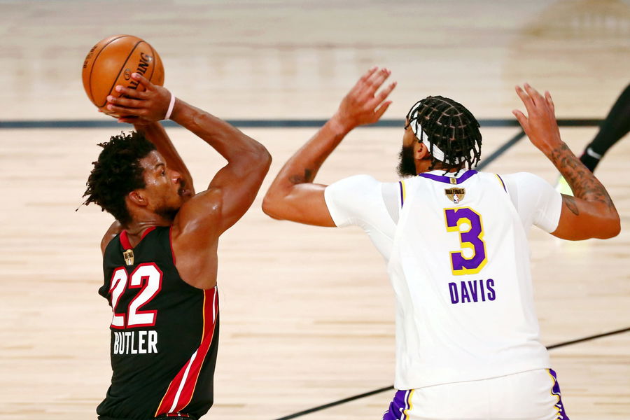 Miami Heat forward Jimmy Butler shoots against Los Angeles Lakers forward Anthony Davis during the fourth quarter of game three of the 2020 NBA Finals. The Miami Heat won 115-104. Mandatory Credit: Kim Klement-USA TODAY Sports