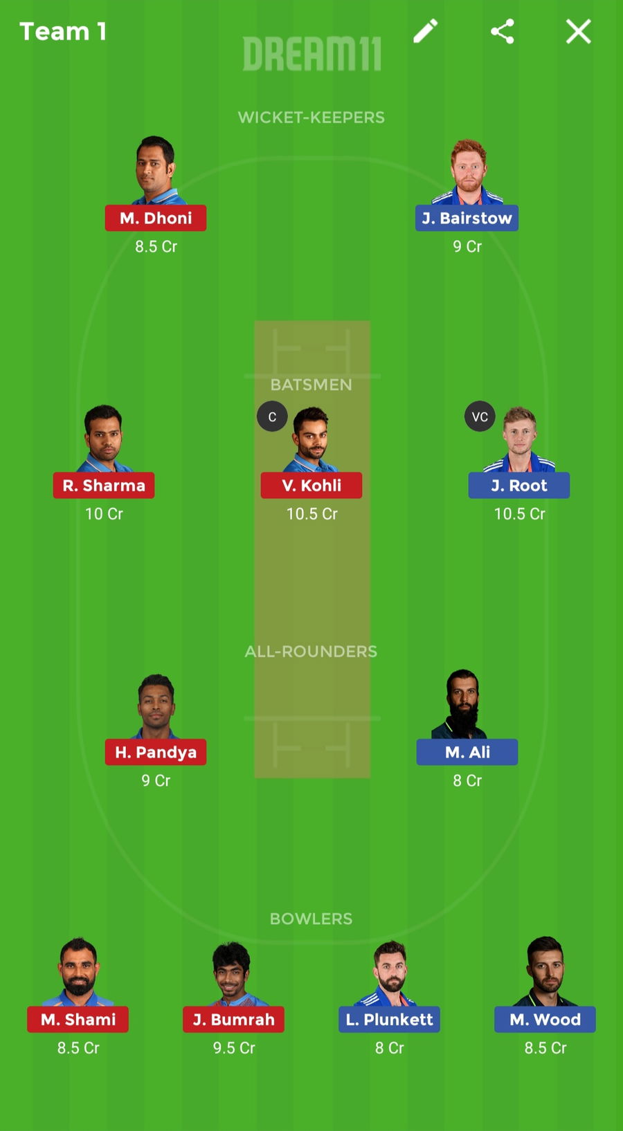 The Dream 11 team also consists of two all-rounders, named Hardik Pandya and Moeen Ali.?Hardik Pandya has been in terrific form with both bat and ball and has taken five wickets so far. He played an important role against West Indies and Pakistan with the bat and has the ability to break partnerships in crucial moments for his team.