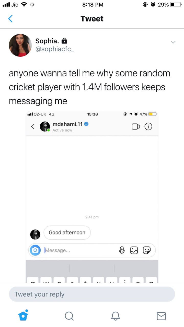 “anyone wanna tell me why some random cricket player with 1.4m followers keeps messaging me,” wrote Sophia.