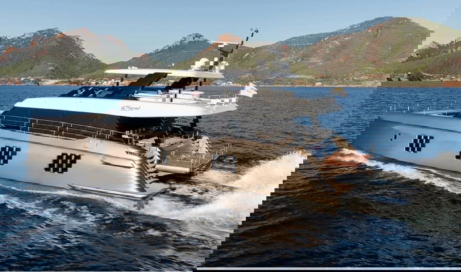 The boat is 80 feet long, which can sleep 12 people at a time and is designed for long cruises. There are many places to relax in the boat including a superyacht-style flybridge that holds a hot tub, a wet bar, and comes with a jet ski.