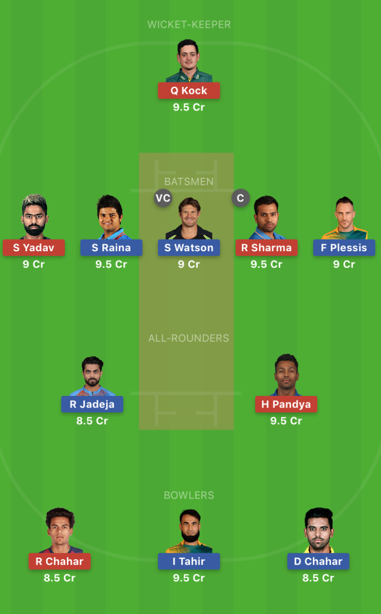 For the bowling trio, the Chennai Super Kings have two players in the CSK vs MI Dream 11 team. They are Imran Tahir and Deepak Chahar, while the final spot is taken by Deepak’s brother Rahul Chahar, for Mumbai Indians. Tahir has 16 wickets at an economy of 6.23. Deepak has amassed 14 wickets at an economy of 6.95. Meanwhile, brother, Rahul Chahar has 9 wickets at an economy of 6.61.