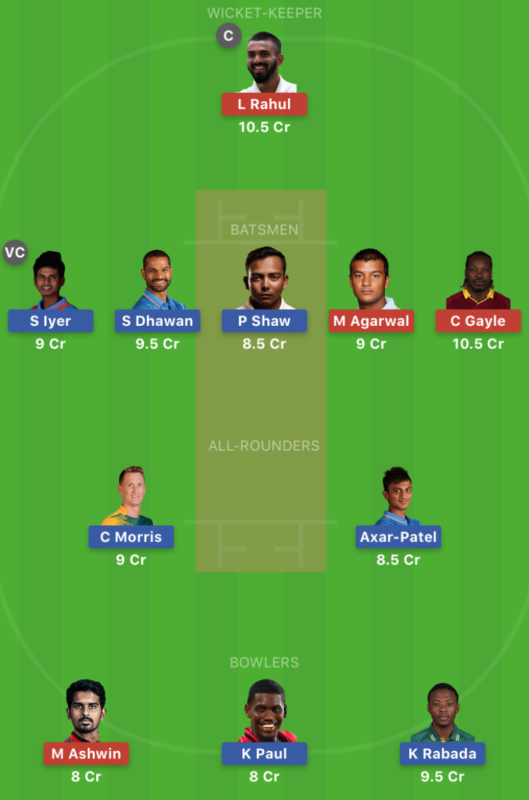The skipper of this KXIP vs DC Dream 11 side is KL Rahul, with Shreyas Iyer serving as the deputy.