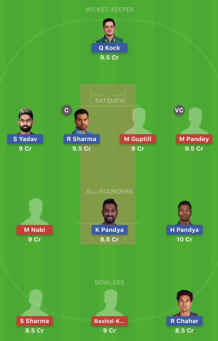 Among the batting quartet in ES’ MI vs SRH Dream 11, two are Mumbai players, namely Suryakumar Yadav and Rohit Sharma. Martin Guptill and Manish Pandey represent Hyderabad in this MI vs SRH clash. Skipper Sharma has a 67 to his name at a strike rate of 131.75 while Yadav has a high score of 59 at a strike rate of 128.70.