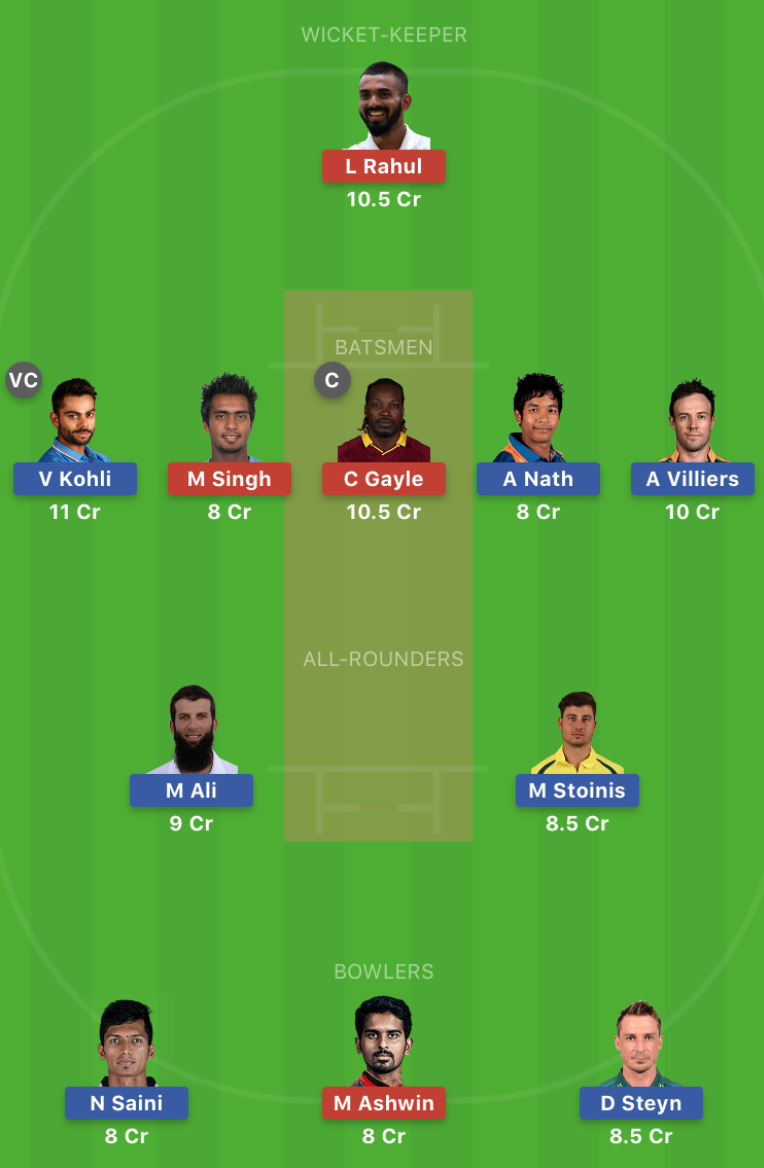 Punjab: Chris Gayle, Karun Nair, KL Rahul, Mandeep Singh, Sam Curran, Moises Henriques, Ravichandran Ashwin, Mohammed Shami, Mujeeb Ur Rahman, Murugan Ashwin, Varun Chakravarthy