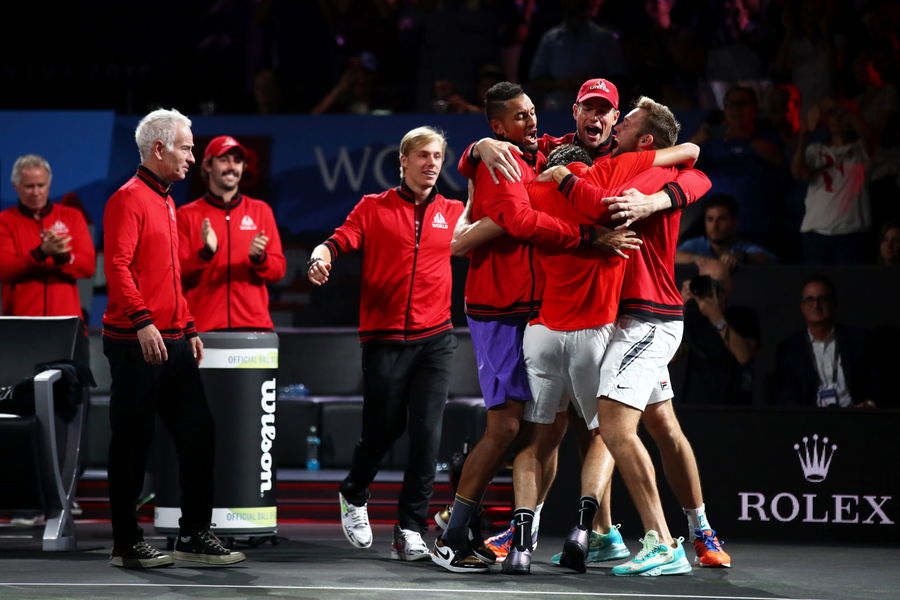 GENEVA, SWITZERLAND – SEPTEMBER 22: Taylor Fritz of Team World celebrates match point with teammates in his singles match against Dominic Thiem of Team Europe during Day Three of the Laver Cup 2019 at Palexpo on September 22, 2019 in Geneva, Switzerland. The Laver Cup will see six players from the rest of the World competing against their counterparts from Europe. Team World captained by John McEnroe and Team Europe captained by Bjorn Borg. The tournament runs from September 20-22. (Photo by Julian Finney/Getty Images for Laver Cup)