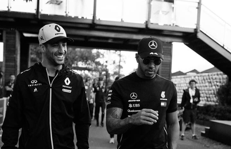 Without a doubt, Daniel Ricciardo is one of the easiest drivers to get along with. The Australian is hardly ever seen without his trademark smile, except when he is out of a race. As it turns out, Lewis Hamilton is pretty good friends with the 29-year old. Recently, Hamilton posted a picture on Twitter and Instagram, of the two together.