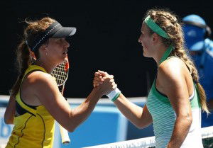 Belarus’ Victoria Azarenka (R) shakes hands with Czech Republic’s Barbora Strycova after Azarenka won their fourth round match at the Australian Open tennis tournament at Melbourne Park, Australia, January 25, 2016. REUTERS/Thomas Peter