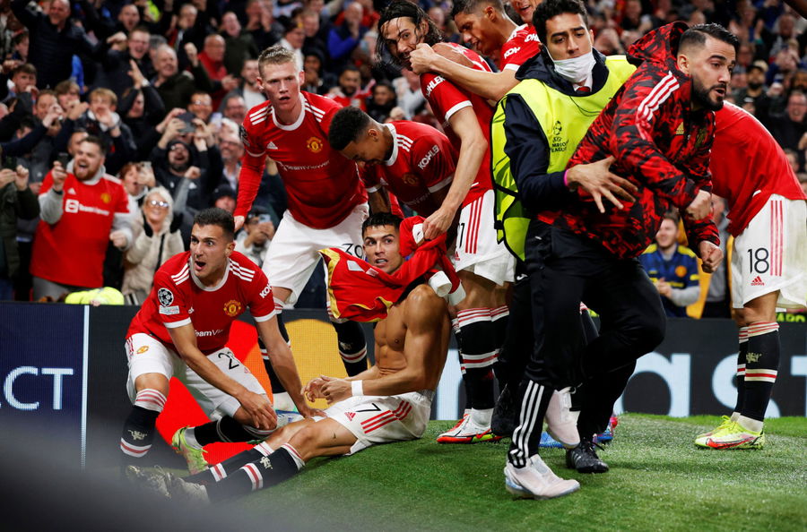 Soccer Football – Champions League – Group F – Manchester United v Villarreal – Old Trafford, Manchester, Britain – September 29, 2021 Manchester United’s Cristiano Ronaldo celebrates scoring their second goal with teammates as security staff catches a fan REUTERS/Phil Noble TPX IMAGES OF THE DAY
