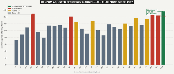 The 2026 Wolverines registered a KenPom adjusted efficiency margin of +39.02, the highest ever clocked by the renowned college basketball rating system.