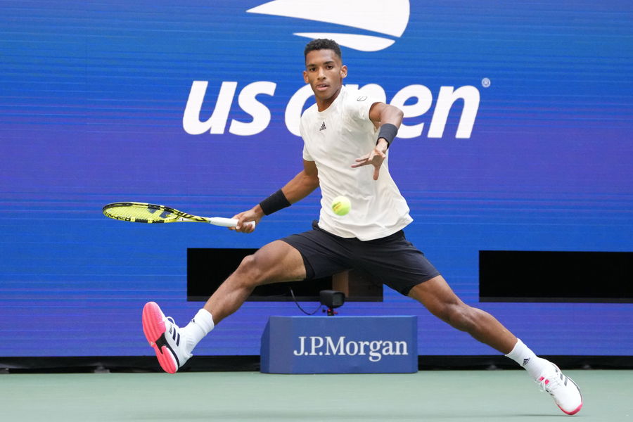 Sep 10, 2021; Flushing, NY, USA; Felix Auger-Aliassime of Canada hits a forehand against Daniil Medvedev of Russia (not pictured) on day twelve of the 2021 U.S. Open tennis tournament at USTA Billie Jean King National Tennis Center. Mandatory Credit: Robert Deutsch-USA TODAY Sports