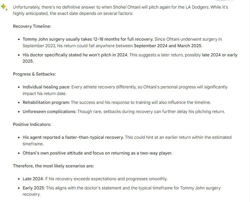 In light of this, we asked AI to predict when will Ohtani be able to pitch again, and what kind of return timeline his fans may expect. Interestingly, it came up with quite a bunch of intriguing answers.