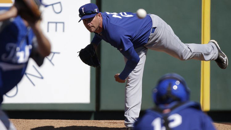 Italy’s Dan Serafini throws before the first inning of an exhibition baseball game against the Angels Wednesday, March 6, 2013.(AP Photo/Morry Gash)