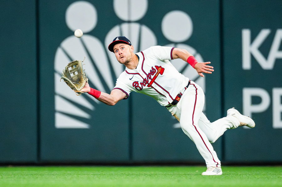 ATLANTA, GA – APRIL 08: Jarred Kelenic #24 of the Atlanta Braves makes a diving catch in the ninth inning against the Philadelphia Phillies at Truist Park on April 8, 2025 in Atlanta, Georgia. (Matthew Grimes Jr./Atlanta Braves/Getty Images)