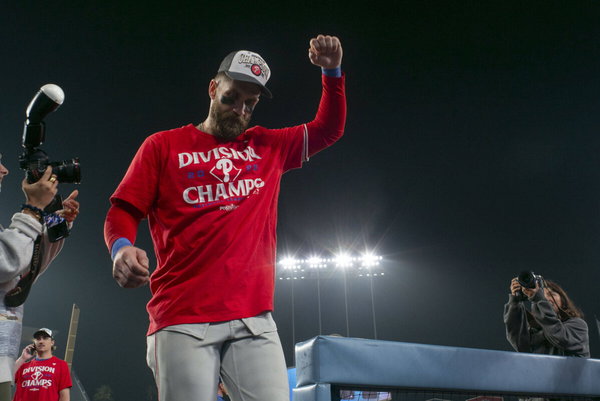 September 15, 2025, Los Angeles, California, USA: Bryce Harper 3 of the Philadelphia Phillies celebrates after clinching the Division Championship Title after defeating the Los Angeles Dodgers in their MLB, Baseball Herren, USA regular season on Monday September 15, 2025 at Dodger Stadium in Los Angeles, California. ARMANDO ARORIZO/PI Los Angeles USA – ZUMAp124 20250915_zaa_p124_056 Copyright: xArmandoxArorizox
