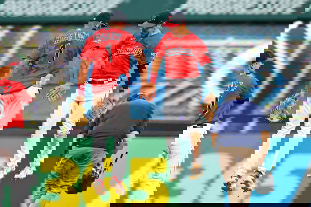 CLEVELAND, OHIO – MAY 22: Amed Rosario #1 and Steven Kwan #38 of the Cleveland Guardians celebrate after the Guardians defeated the Chicago White Sox at Progressive Field on May 22, 2023 in Cleveland, Ohio. The Guardians defeated the White Sox 3-0. (Photo by Jason Miller/Getty Images)