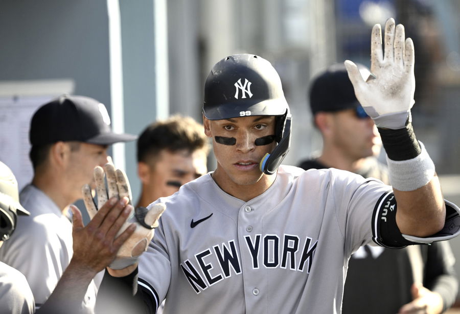 Los Angeles, – June 03: Aaron Judge of the New York Yankees high fives teammates after hitting a solo home run against the Los Angeles Dodgers in the sixth inning of a baseball game at Dodger Stadium in Los Angeles on Saturday, June 3, 2023. (Photo by Keith Birmingham/MediaNews Group/Pasadena Star-News via Getty Images)