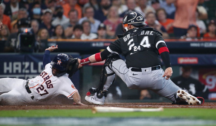Oct 7, 2021; Houston, Texas, USA; Houston Astros second baseman Jose Altuve (27) scores a run past Chicago White Sox catcher Yasmani Grandal (24) during the third inning during game one of the 2021 ALDS at Minute Maid Park. Mandatory Credit: Troy Taormina-USA TODAY Sports