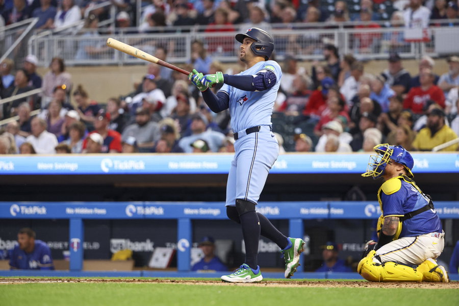 June 6, 2025, Minneapolis, Minnesota, United States: Toronto Blue Jays player GEORGE SPRINGER watches the ball leave the field for a home run. The Minnesota Twins and the Toronto Blue Jays faced off at Target Field on June 6th. The Toronto Blue Jays were victorious by a score of 6-4. Minneapolis United States – ZUMAt166 20250606_zsp_t166_018 Copyright: xMichaelxTurnerx