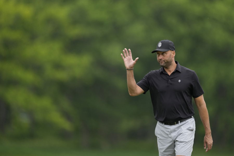 MADISON, WISCONSIN – JUNE 11: Former Major League Baseball player Derek Jeter waves to the crowd as he walks onto the 18th green during the Celebrity Foursome at the second round of the American Family Insurance Championship at University Ridge Golf Club on June 11, 2022 in Madison, Wisconsin. (Photo by Patrick McDermott/Getty Images)