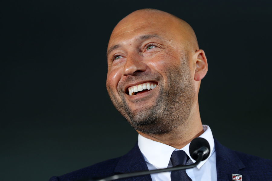 COOPERSTOWN, NY – SEPTEMBER 08: Hall of Fame Inductee Derek Jeter speaks during the 2021 Hall of Fame Induction Ceremony at Clark Sports Center on Wednesday, September 8, 2021 in Cooperstown, New York. (Photo by Mary DeCicco/MLB Photos via Getty Images)