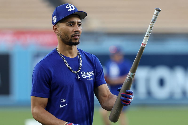 Apr 30, 2024; Phoenix, Arizona, USA; Los Angeles Dodgers infielder Mookie Betts reacts during a delay to the game against the Arizona Diamondbacks due to a swarm of bees at Chase Field. Mandatory Credit: Mark J. Rebilas-USA TODAY Sports