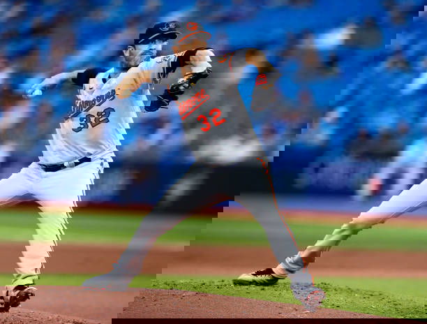 TORONTO, ON – SEPTEMBER 01: Matt Harvey #32 of the Baltimore Orioles delivers a pitch during an MLB game against the Toronto Blue Jays at Rogers Centre on September 1, 2021, in Toronto, Ontario, Canada. (Photo by Vaughn Ridley/Getty Images)