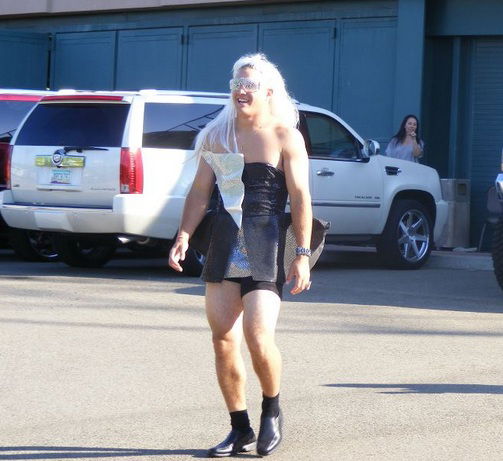 Trout was wearing a black and silver dress that covered half of his thighs. He had star-studded goggles on. And to top it all off, he had a blonde wig on his head, which made him look like Gaga.