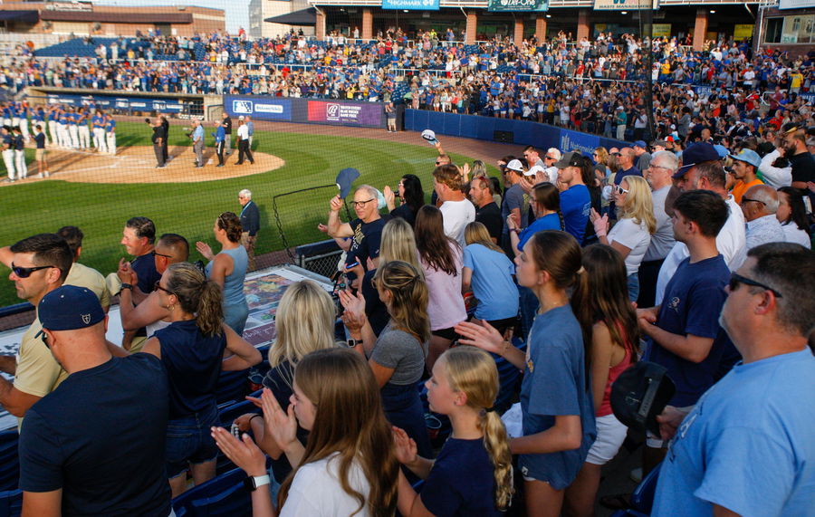 A good crowd on a beautiful night for baseball stands for the National Anthem before Salesianum’s 7-3 win over Caesar Rodney in the DIAA state tournament championship game, Saturday, June 1, 2024 at Frawley Stadium.